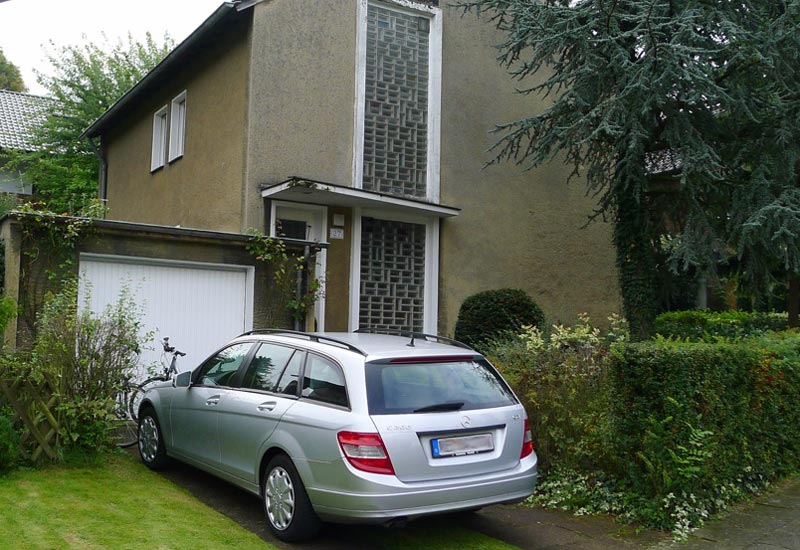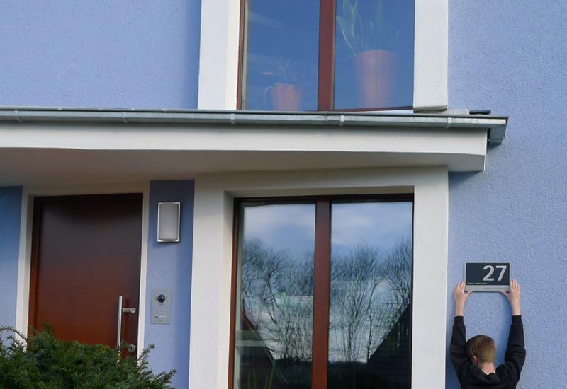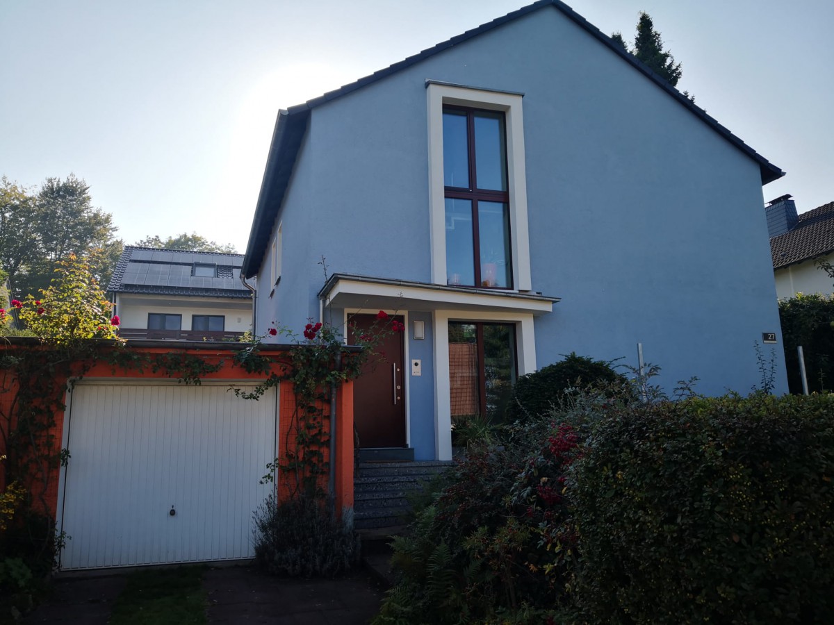 Nach der Sanierung zeigt sich das Einfamilienhaus in modernen Tönen mit Komplementärkontrast. Fenster und Türen wurden optisch in Szene gesetzt und verleihen der Fassade eine stilvolle und zugleich angenehm frische Nuance.